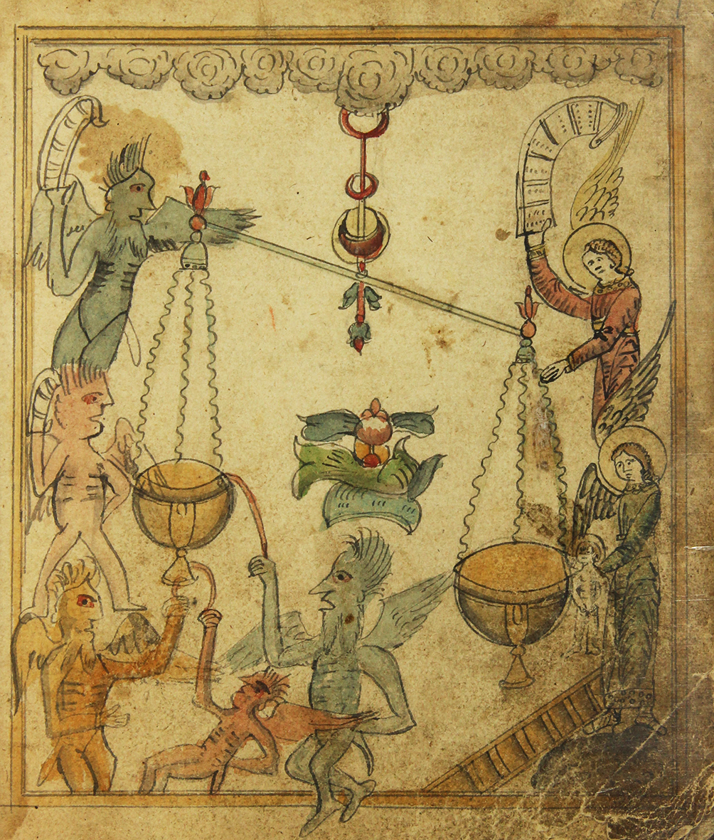 «Взвешивание» добрых и злых дел души ангелами и демонами. Миниатюра к сочинению «Житие Василия Нового и Григориево видение». Кон. XVIII в. ЛАИ ИГНИ УрФУ. V. 77р/1094. Л. 14